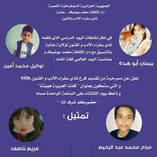 ينظم اليوم الثلاثاء نادي سفراء الأدب والفنون الولاية عنابة باليوم العالمي للغة العربية بالتنسيق مع دار الثقافة محمد بوضياف لولاية عنابة، يوما دراسيا حول لغة الضاد تحت شعار: “تعلموا العربية فإنها تزيد في المروءة”، وذلك احتفاء بذكرى اليوم العالمي للغة العربية المصادف للثامن عشر من ديسمبر كل سنة، كما يتضمن هذا اليوم عرضا مسرحيا من تقديم فرع نادي سفراء الأدب والفنون kids، وسيحمل عنوان “لغتنا العربية هويتنا”.