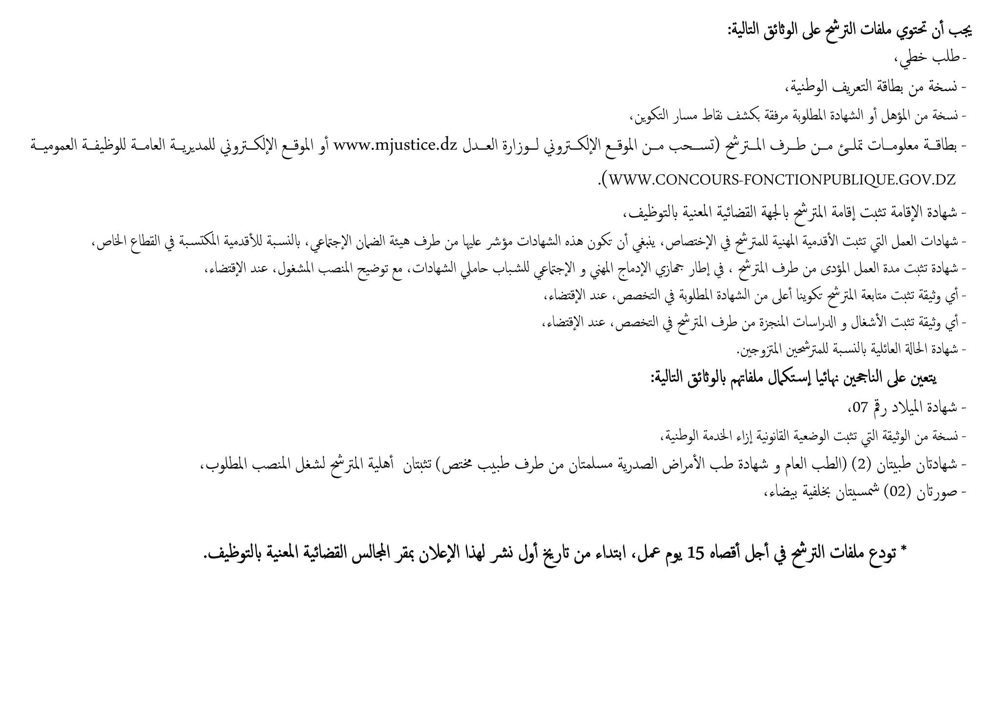 وأعلمت وزارة العدل الراغبين في الترشح للمناصب المفتوحة في المسابقة أن ملفات الترشّح تودع قبل انقضاء 15 يوما على نشر الإعلان بمقر المجالس القضائية المعنية بالتوظيف.
