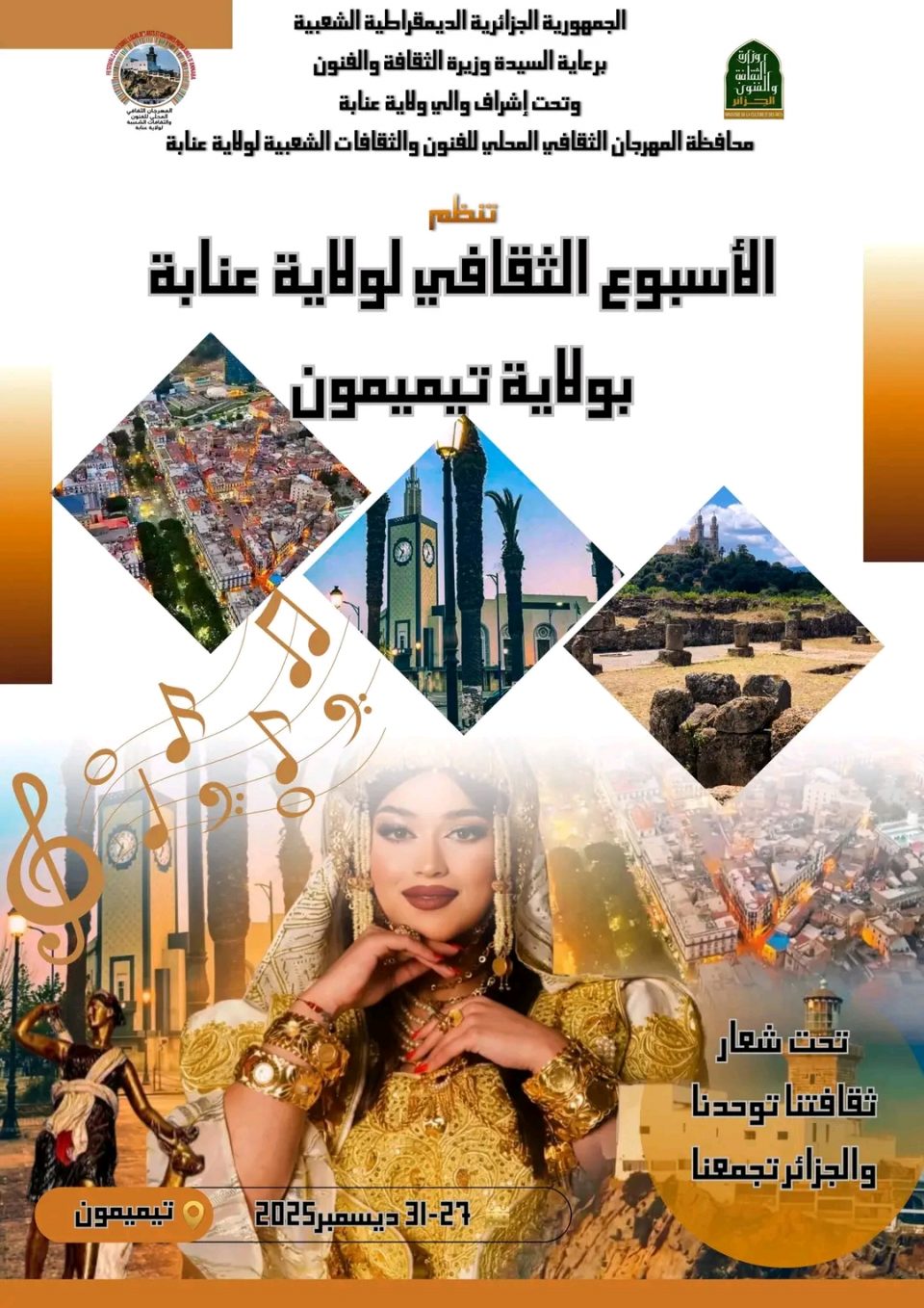 تنظم محافظة المهرجان الثقافي المحلي للفنون والثقافات الشعبية لولاية عنابة، الأسبوع الثقافي لولاية عنابة بولاية تيميمون، وذلك خلال الفترة الممتدة من 27 إلى 31 ديسمبر الجاري، تحت شعار “ثقافتنا توحدنا والجزائر تجمعنا”.