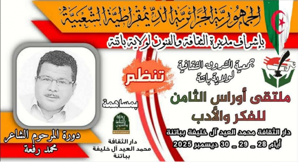 افتتحت أمس  بدار الثقافة محمد العيد آل خليفة بولاية باتنة، فعاليات ملتقى الأوراس الثامن للفكر والأدب، الذي تنظمه جمعية الشروق الثقافية لولاية باتنة، تحت إشراف مديرية الثقافة والفنون، وذلك في دورة تحمل اسم الشاعر الراحل “محمد رفقة” تكريما لمسيرته الإبداعية وإسهاماته الأدبية.