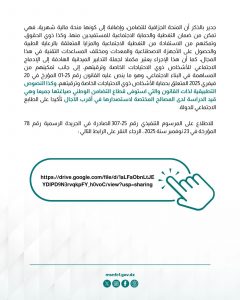 ويعد هذا الإجراء، يضيف البيان، “مكملا لجملة التدابير الميدانية الهادفة إلى الإدماج الاجتماعي للأشخاص ذوي الاحتياجات الخاصة وترقيتهم إلى جانب تمكينهم من المساهمة في البناء الاجتماعي، وهو ما ينص عليه القانون رقم 25-01 المؤرخ في 20 فيفري 2025 المتعلق بحماية الأشخاص ذوي الاحتياجات الخاصة وترقيتهم، وكذا النصوص التطبيقية لذات القانون والتي استوفى قطاع التضامن الوطني صياغتها جميعا وهي قيد الدراسة لدى المصالح المختصة لاستصدارها في أقرب الآجال تأكيدا على الطابع الاجتماعي للدولة”.