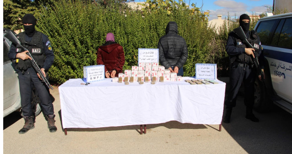 تمكن عناصر الفرقة المتنقلة للشرطة القضائية لأمن ولاية خنشلة بناءا على معلومات تحصلوا عليها ، من توقيف مركبة سياحية على متنها شخص وامرأة يبلغان من العمر 35 و 38 سنة بحوزتهما 180 صفيحة مخدرات بوزن 20 كلغ بالإضافة إلى مبلغ مالي بالعملة الوطنية من عائدات الترويج ليتم انجاز ملفين جزائيين ضدهما وتقديمهما أمام النيابة المحلية.