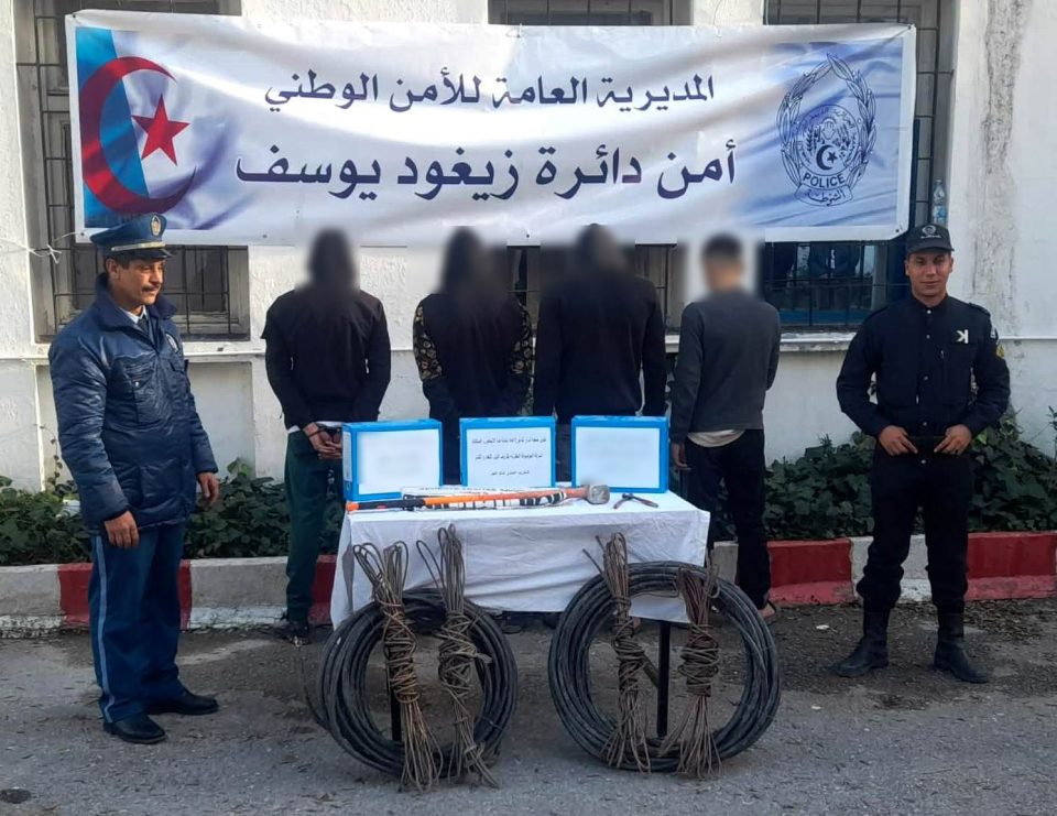 تمكنت قوات الشرطة بأمن دائرة زيغود يوسف من توقيف جمعية أشرار مكونة من 4 أشخاص تتراوح أعمارهم ما بين 19 و25 سنة ، لضلوعهم في سرقة الكوابل النحاسية.