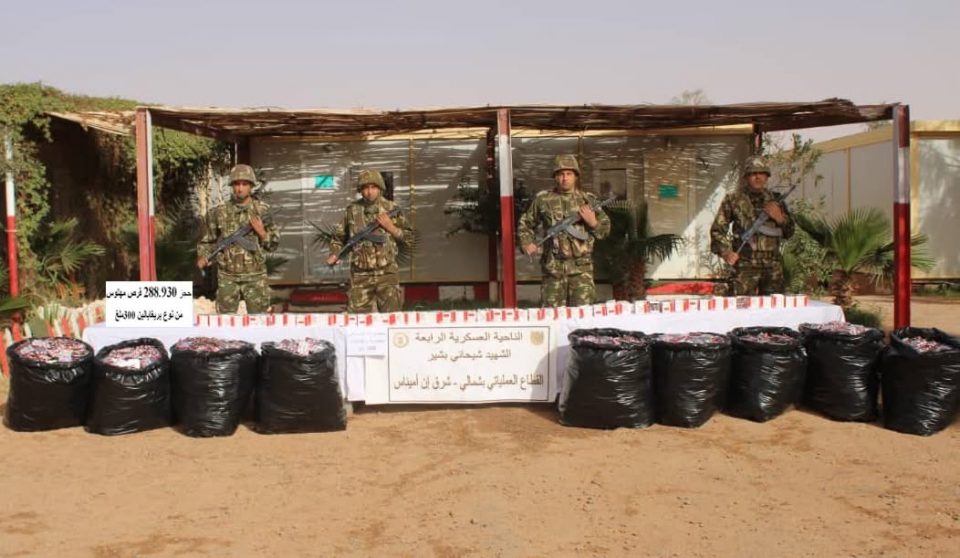 تمكنت مفارز للجيش الوطني الشعبي, بالتنسيق مع مختلف مصالح الأمن, خلال عمليات نفذت الأسبوع الماضي عبر مختلف النواحي العسكرية, من إحباط محاولات إدخال أزيد من 4,5 قنطارا من الكيف المعالج عبر الحدود مع المغرب وما يقارب 1,4 مليون قرص مهلوس, حسب ما أوردته اليوم الأربعاء, حصيلة عملياتية للجيش الوطني الشعبي.