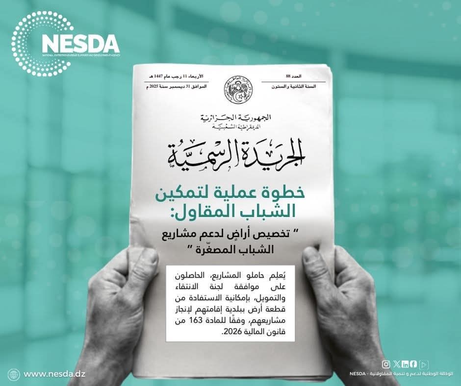 وحسب بيان لوكالة “نسدا”، فإن المادة 163 من قانون المالية 2026، حملت مستجدات هامة لفائدة حاملي المشاريع حيث أصبح بإمكان أصحاب المشاريع الذين تحصّلوا على موافقة لجنة الانتقاء والتمويل (CSVF)، على قطعة أرض في خطوة تهدف إلى إزالة أحد أبرز العراقيل التي تواجه المستثمرين الشباب، والمتمثلة في صعوبة الحصول على العقار.